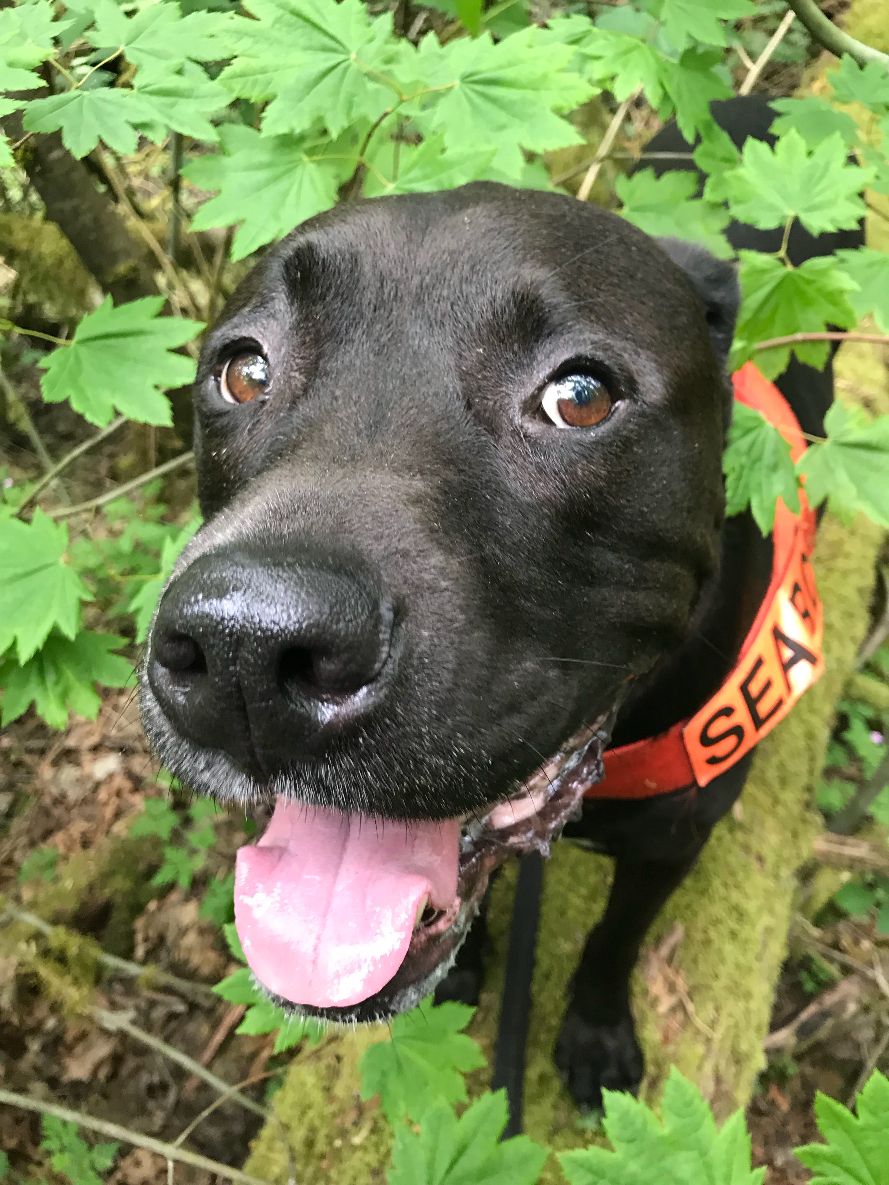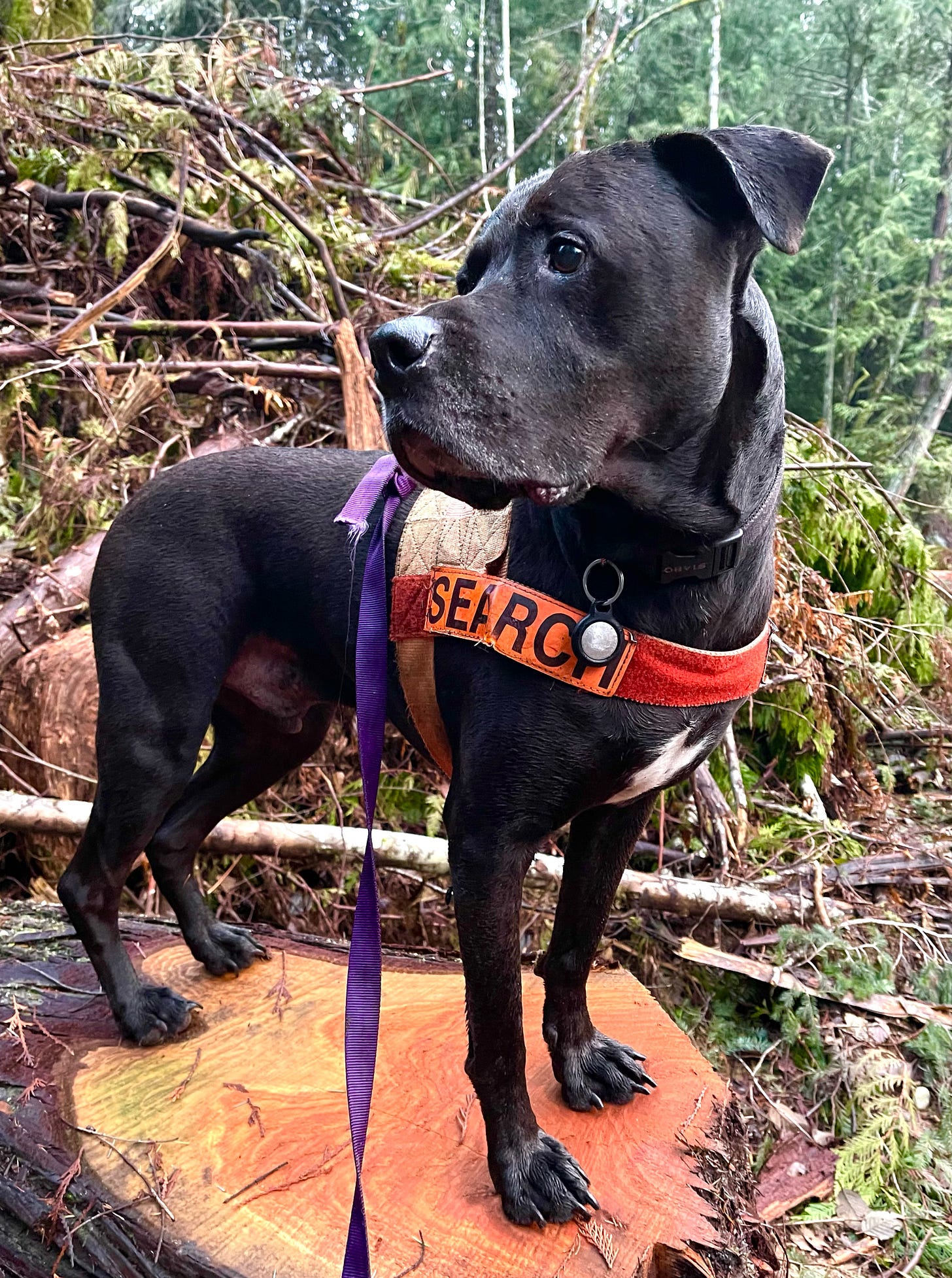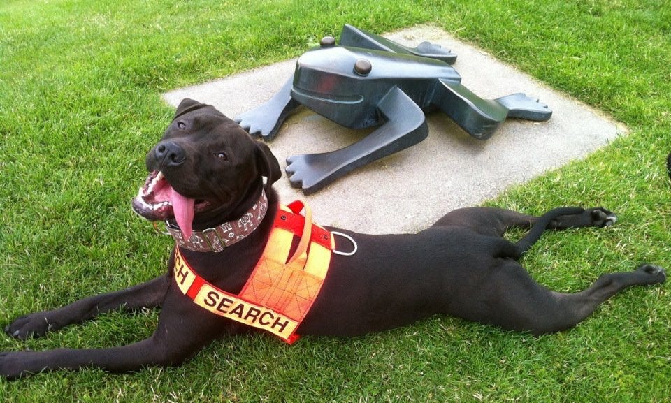 Working the cat detection dog is very different than working the scent trailing dog. With Tino, most of the time, I hold on and try not to die as he drags me around on the scent trail. With Mu, it is mostly much calmer. We start out with a strategy, and I direct him to check certain hiding places as we do a thorough grid search. He rarely pulls hard unless he has found a cat. I have to be ready to hang on tight, but it’s not like he is yanking my arms off for three hours, like Tino.
