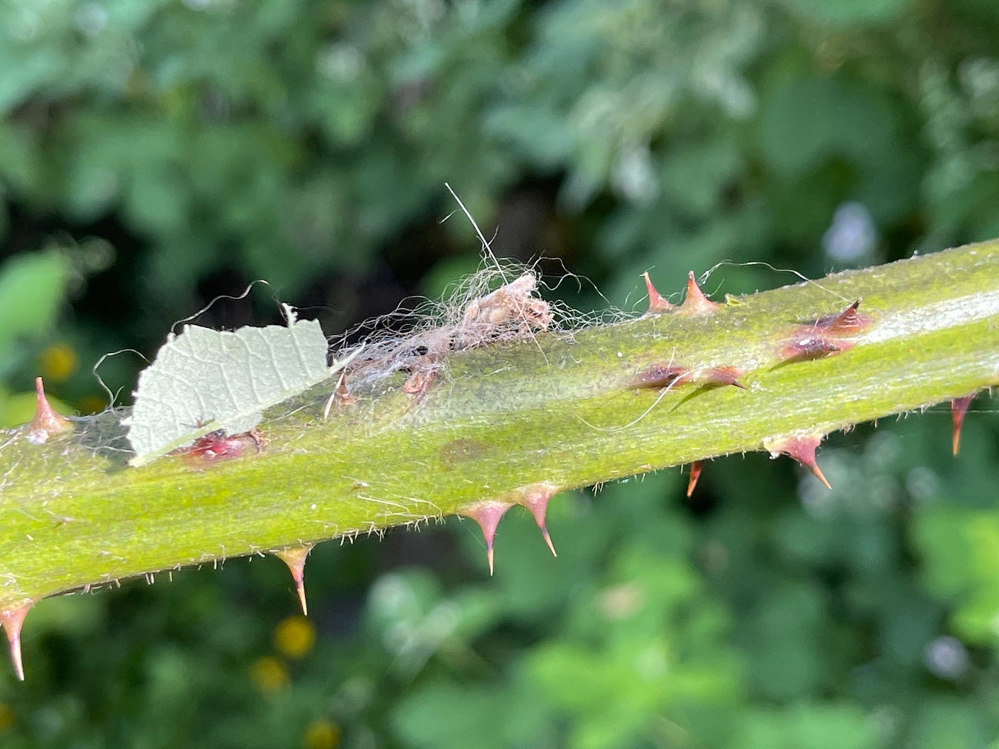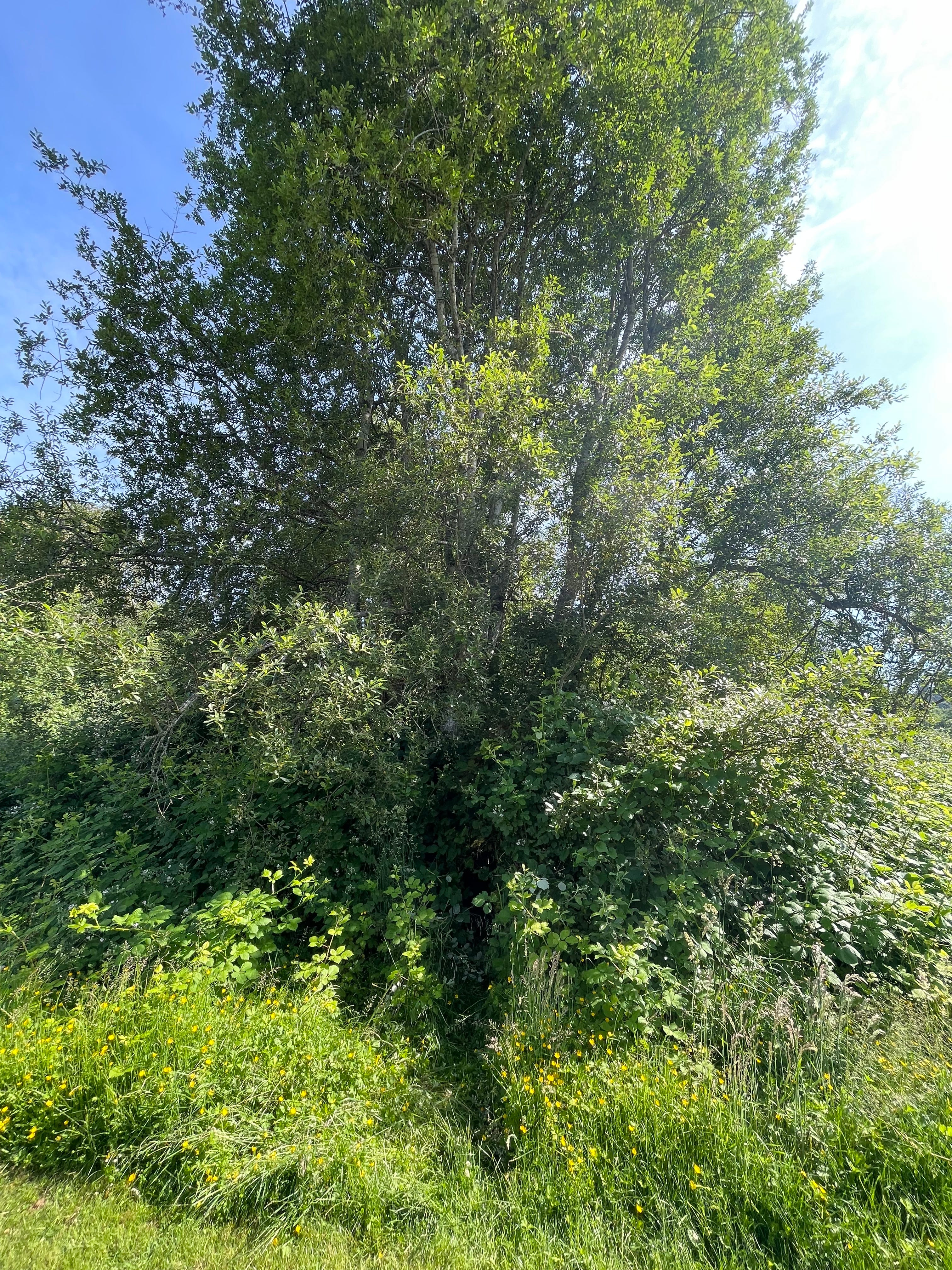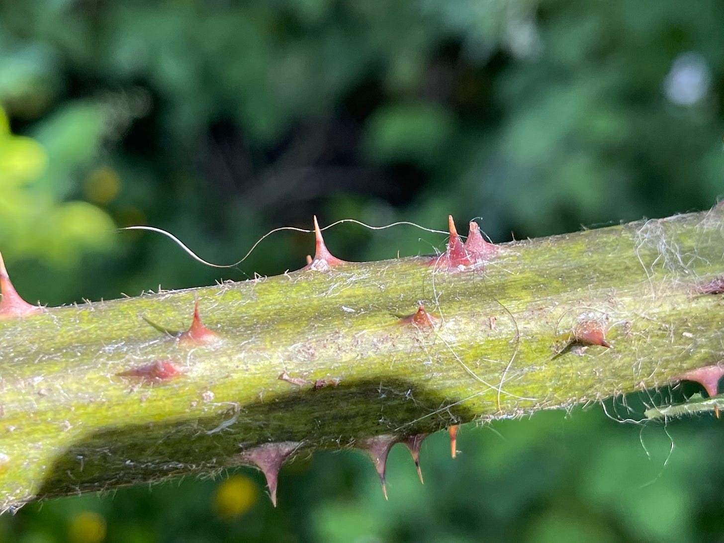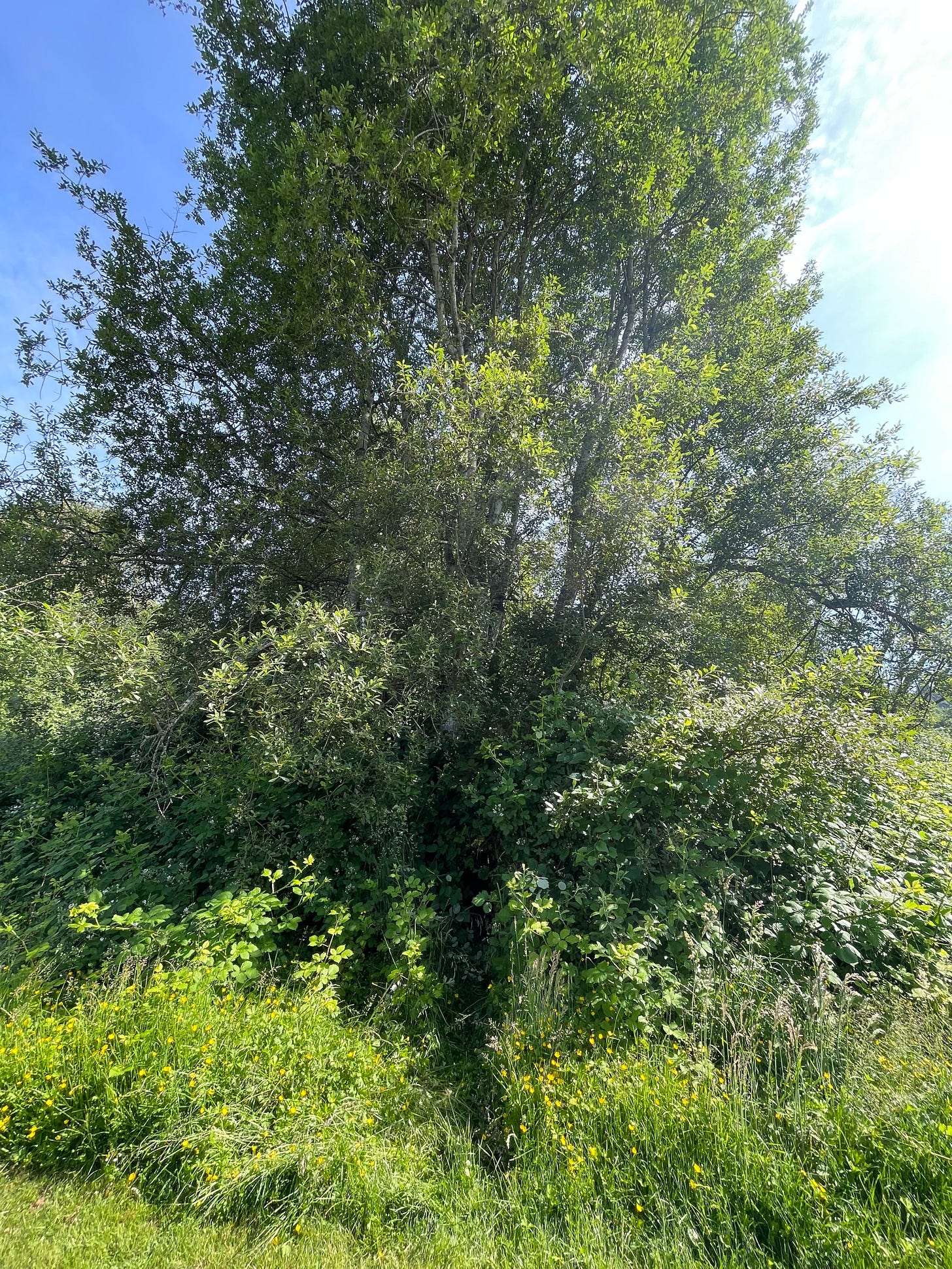 After two hours of searching, Mu found a place where there was an animal trail going into the thick brambles by a large old willow tree. Mu waited while I took a closer look. Blackberry thorns are a problem, if you are trying to find a cat, but one useful thing about them is that they collect fur, and you can see who passed by recently. I thought the fur on the brambles could be a match for Roo. I texted my pictures to the owner, who was searching another area. She said she did not think it was a match, but she would come and check. I had Mu poke his head into the thicket, but he did not give a strong indication of a cat, as if the cat was right nearby. It was more like interest, like a cat had passed through there.