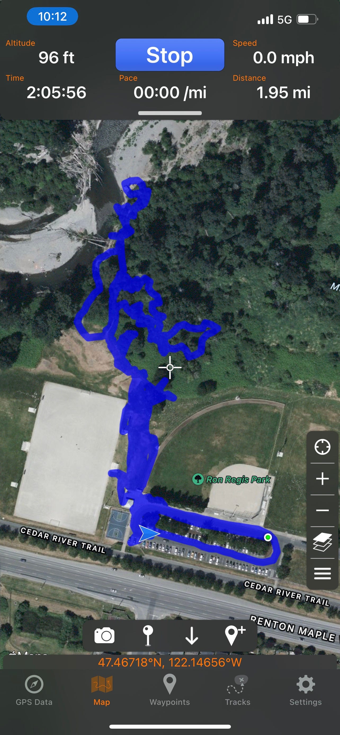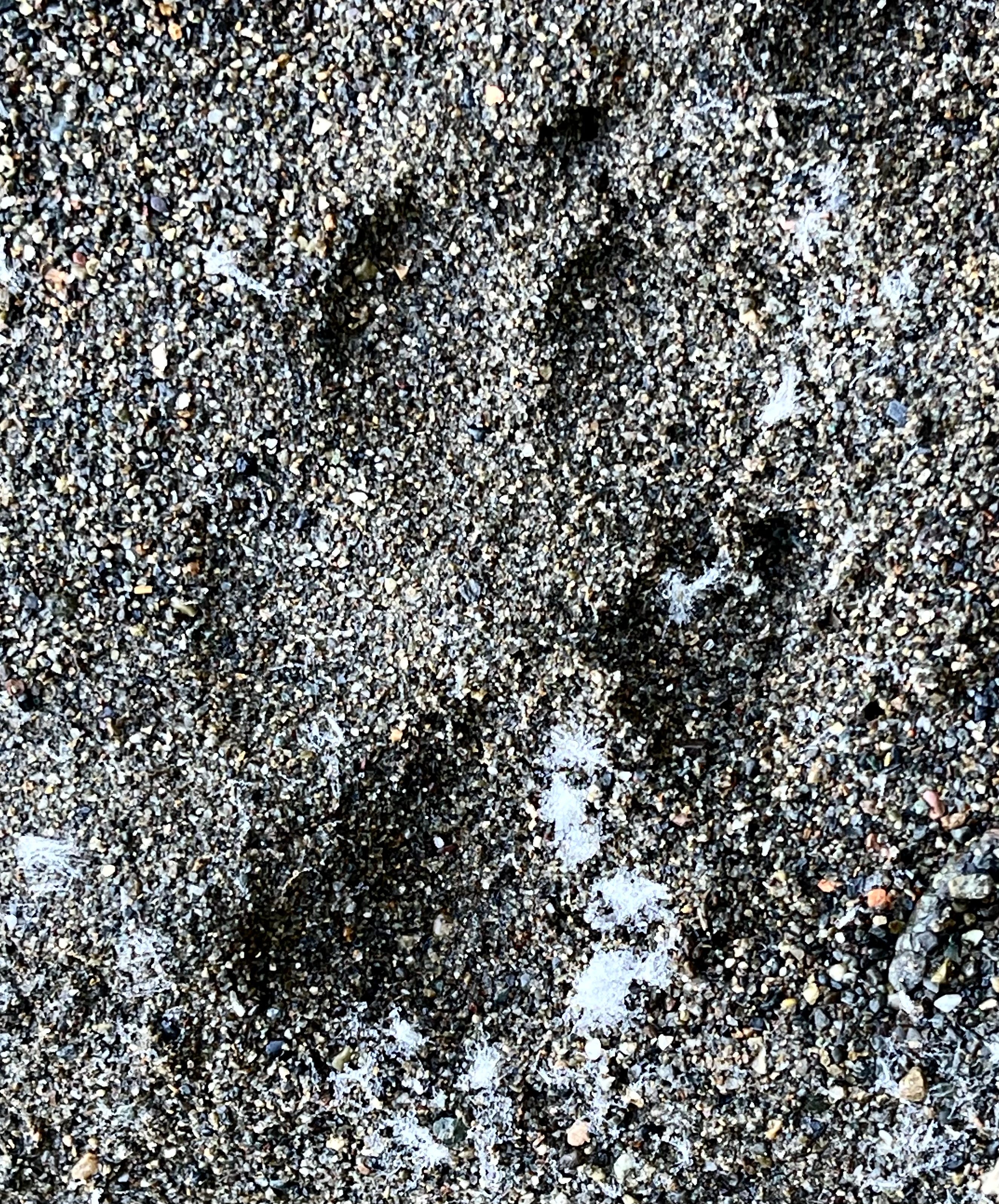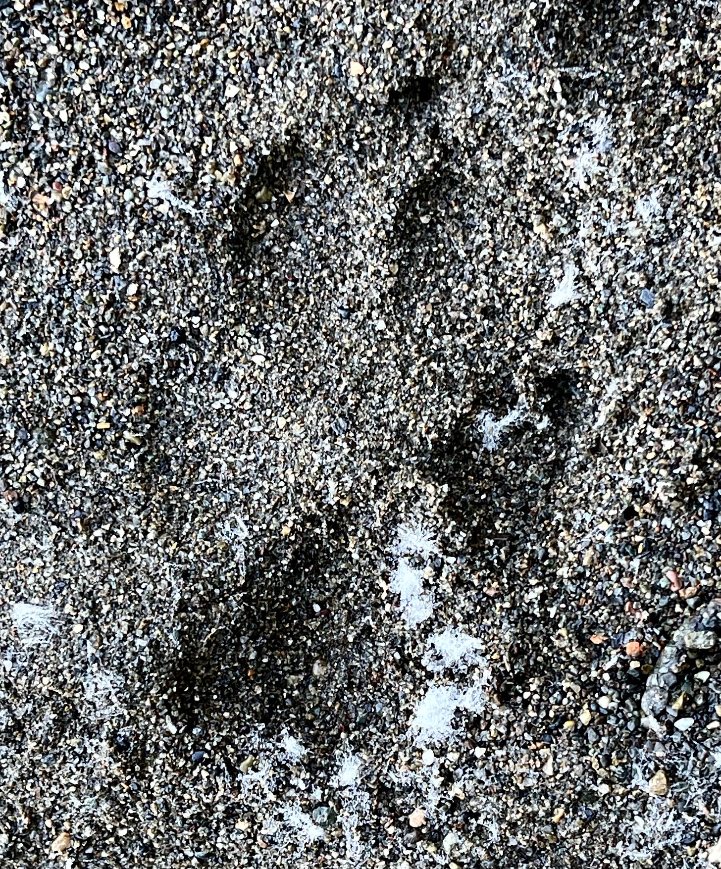 Mu and I searched all around through the brush between the soccer field and the river for two hours. I had to lift Mu over a giant cottonwood log. I also had to crawl on my hands and knees in places to get through the brush. We found coyote prints down by the river, which was to be expected.