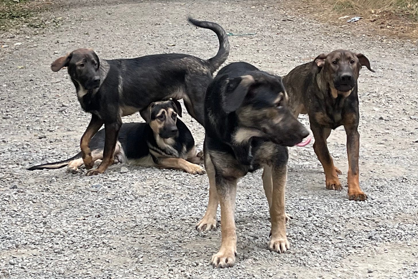 When I first arrived, they all looked nearly the same to me, obviously siblings. They moved around so much it was really kind of hard to keep track of which was which. I wanted to name them in order to keep track of who was doing what, and learn more about their individual personalities. The use of Calming Signals is as much about observation and learning a dog’s behavior as it is signaling to them. Because they were young, and brothers, and there were four of them, I thought of the Teenage Mutant Ninja Turtles. I had actually forgotten the characters’ names and had to google it. I named them from lightest to darkest. Donatello had mostly blonde color on his face with black accents. Leonardo had more black and less cream. Michelangelo had a dark brindle face. Raphael had a black muzzle and a dark face. I soon learned that Donatello was the leader. He was the first to come up to me, the first to eat from my hand, and the first to let me pet him. Raphael was the last to let me pet him, but once Raphael felt he could trust me, he really became attached to me, much more than the others.